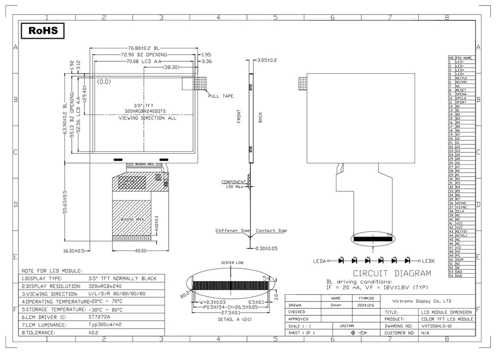 TFT LCD ist eine Art Flüssigkristallanzeige, die die Dünnfilmtransistor-Technologie verwendet, um die Bildqualität zu verbessern, und es hat zahlreiche Anwendungen im Alltag. Was macht das Victronix -3,5 -Zoll -320 × 240 QVGA IPS -TFT -Modul als professionelles TFT -Modulhersteller und -Lieferant in China von anderen Herstellern? Erstens bietet es eine typische Helligkeit von 300 Cd/m², breite 80 ° -Stickwinkel in alle Richtungen und ein Kontrastverhältnis von 800: 1, was eine hervorragende Lesbarkeit aus verschiedenen Winkeln gewährleistet. Zweitens integriert es eine Hintergrundbeleuchtung mit 6S -weißen LEDs mit einer typischen Lebensdauer von 30.000 bis 50.000 Stunden (bis 50% anfängliche Helligkeit), um eine klare Sichtbarkeit bei allen Beleuchtungsbedingungen zu gewährleisten. Außerdem unterstützt es eine RGB-24-Bit-Schnittstelle mit dem ST7272A-Controller. Darüber hinaus führt es strenge Umwelttests durch, einschließlich thermischer Schock (-30 ° C ↔ +80 ° C-Zyklen), Luftfeuchtigkeitspeicherung (60 ° C/90% RH) und mechanischer Schwingung, um sicherzustellen, dass es nahtlos über einen verlängerten Temperaturbereich (-20 ° C bis +70 ° C) arbeiten kann.